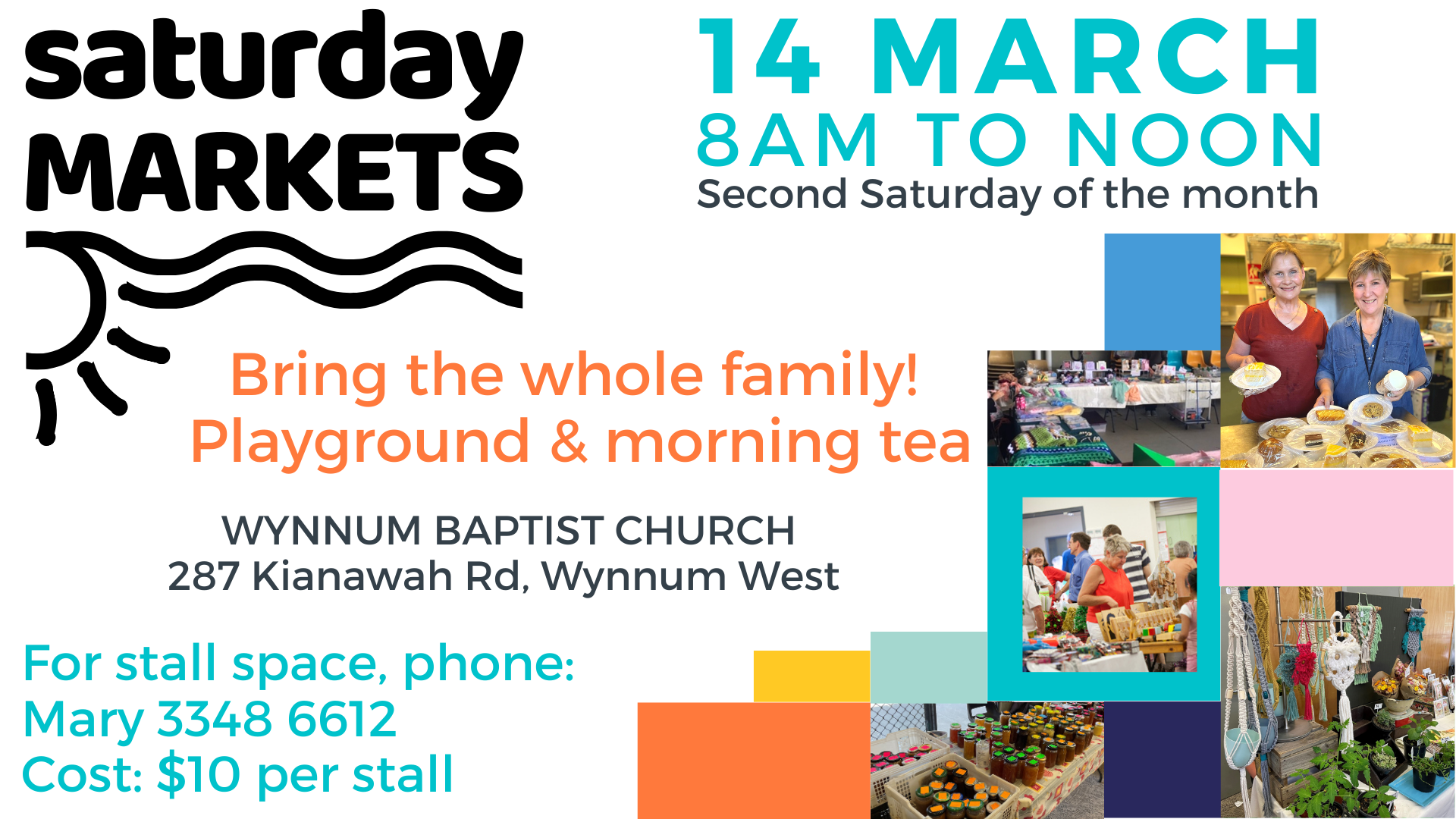 Saturday Markets Saturday 14 March 2026 8:00 am 12:00 pm Wynnum Baptist Church 287 Kianawah Road Wynnum West, QLD, 4178 Australia (map) Google Calendar ICS
