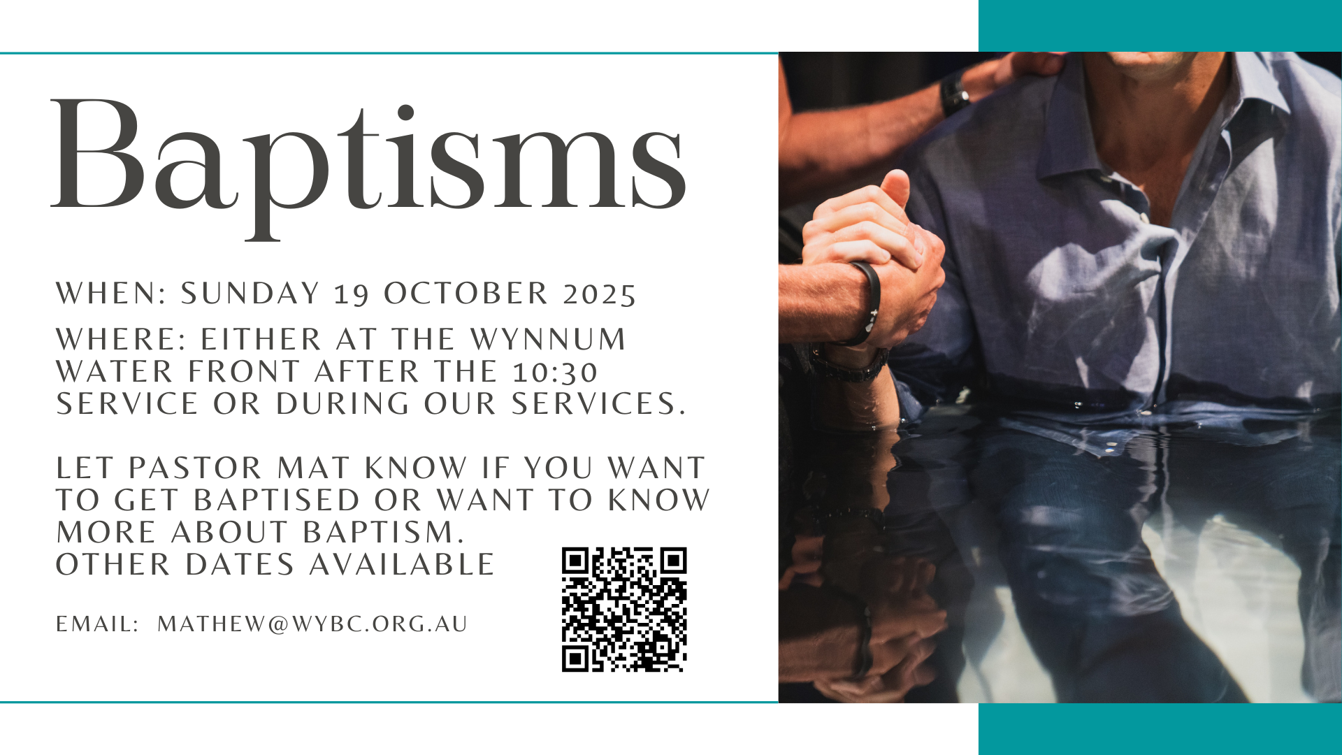 Baptisms Sunday 19 October 2025 8:30 am 12:00 pm Wynnum Baptist Church 287 Kianawah Road Wynnum West, QLD, 4178 Australia (map) Google Calendar ICS