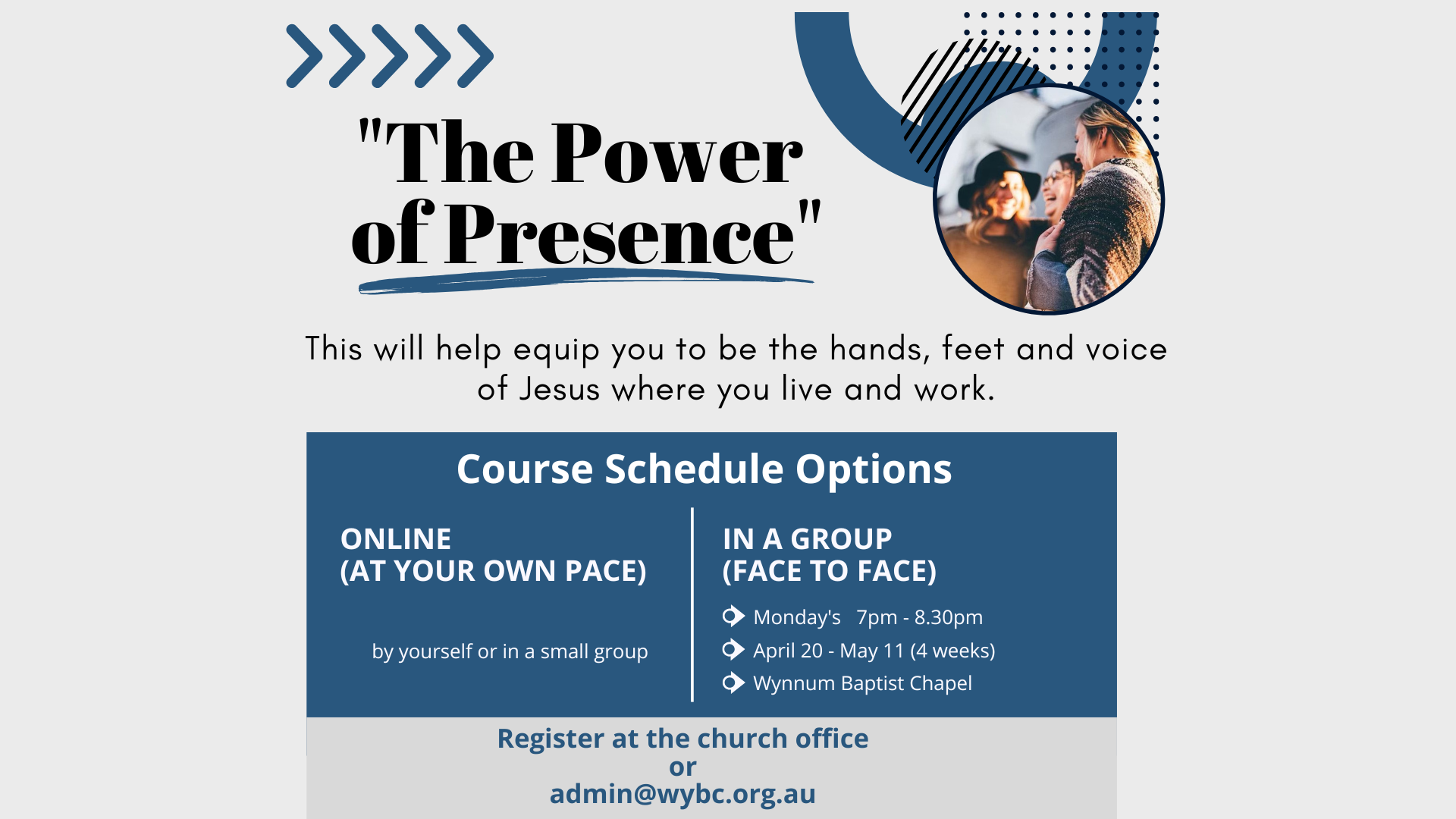 Back to All Events "Power of Presence" Course Monday 4 May 2026 7:00 pm 8:30 pm Wynnum Baptist Church 287 Kianawah Road Wynnum West, QLD, 4178 Australia (map) Google Calendar ICS